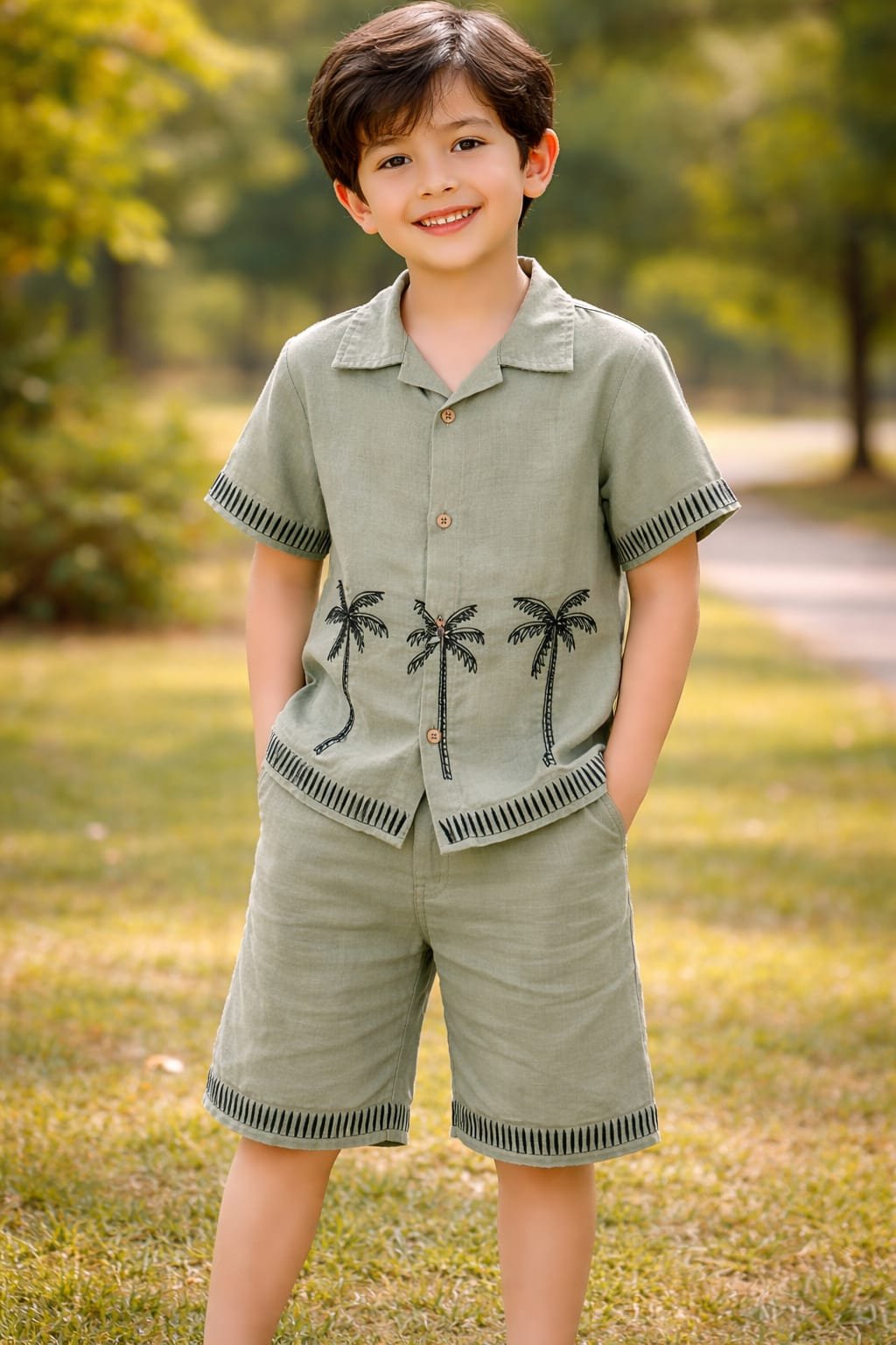This palm embroidered shirt is a perfect blend of subtle style and comfort for your child’s wardrobe. Featuring elegant palm tree embroidery along the front, it adds a trendy tropical touch to a solid base. The classic collared neckline and front button closure give it a neat and polished look, while the short sleeves ensure breathability for all-day comfort. Designed with lightweight and soft fabric, it allows easy movement, making it ideal for active kids. The relaxed fit and minimal detailing make it suitable for casual outings, vacations, or small gatherings. Pair it with shorts or trousers for a stylish and effortless outfit.