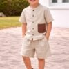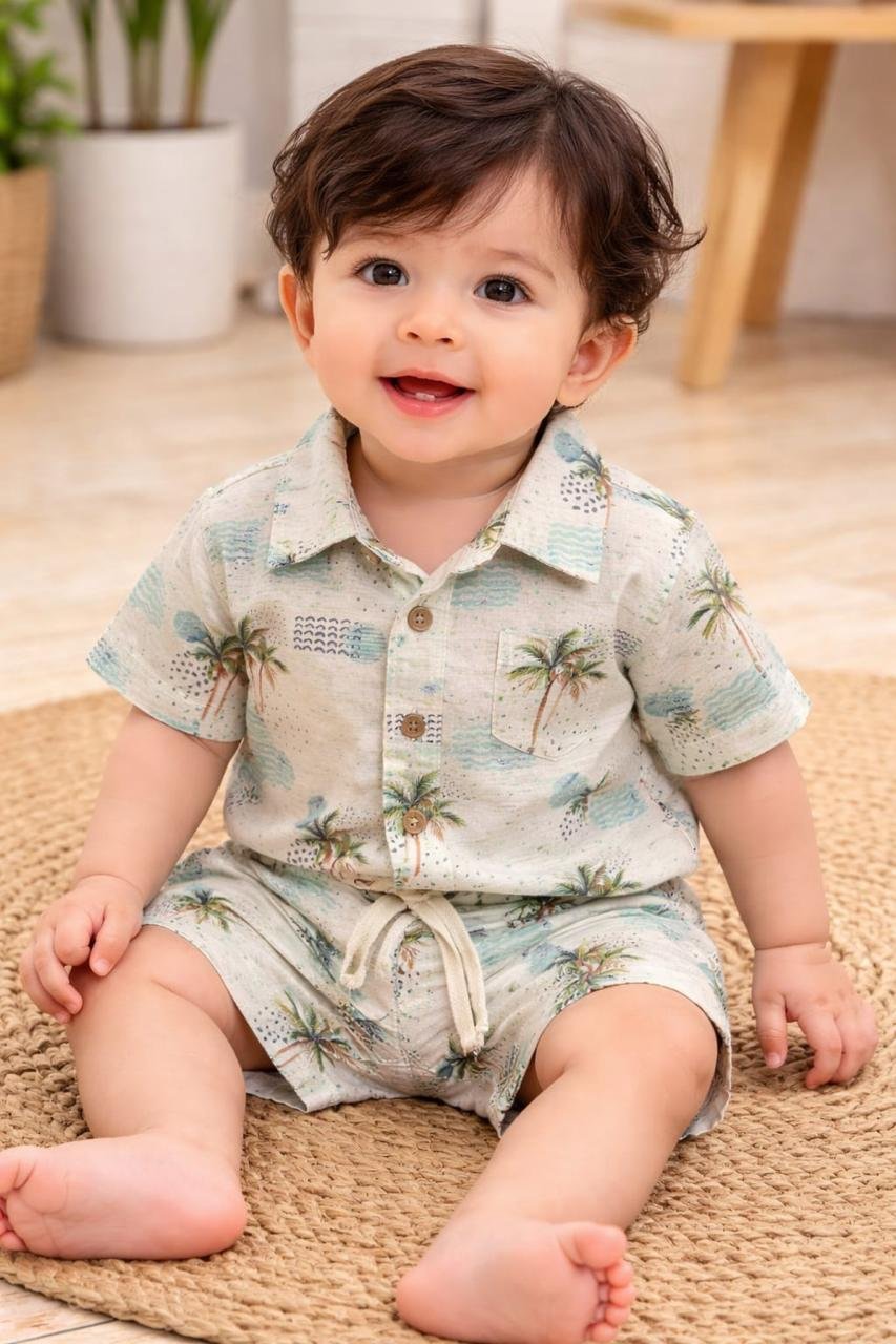 This stylish palm print shirt is perfect for giving your child a cool and relaxed summer look. Featuring subtle tropical patterns with palm trees and abstract elements, it creates a fresh and breezy vibe ideal for warm days. The classic collared neckline and front button closure offer a neat and polished appearance, while the short sleeves ensure comfort and breathability. Made from lightweight and soft fabric, it allows easy movement, making it perfect for active kids. Whether for vacations, outings, or casual wear, this shirt pairs effortlessly with shorts or trousers for a smart yet laid-back outfit.