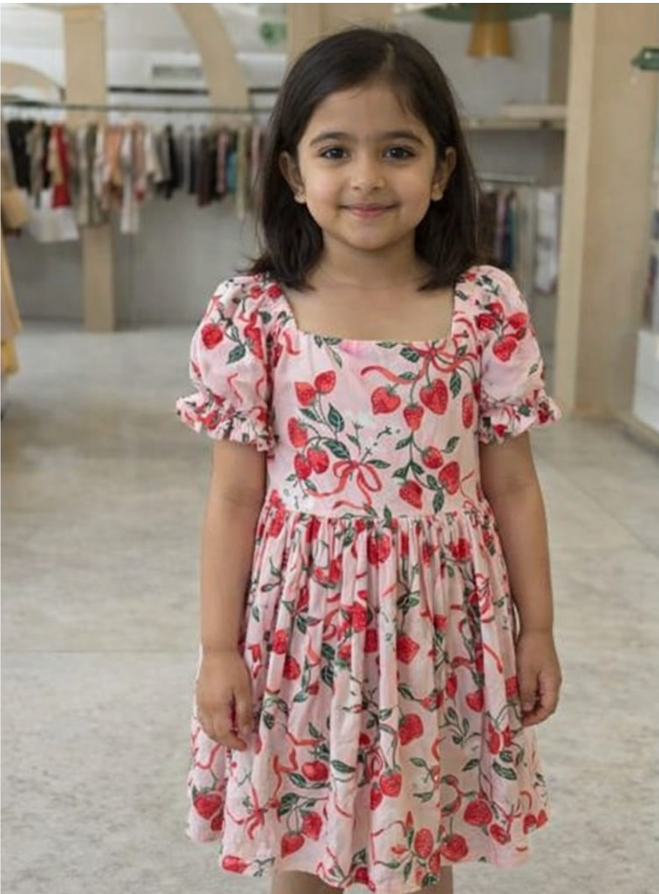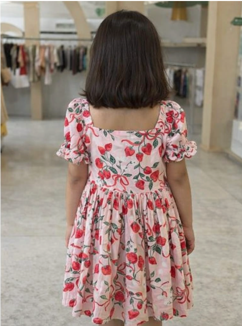 This adorable strawberry print dress is perfect for adding a fun and playful touch to your child’s wardrobe. Featuring a soft pastel base with vibrant strawberry and ribbon prints, it creates a cheerful and eye-catching look. The square neckline and puff sleeves add a trendy and cute silhouette, while the elasticated sleeves ensure a comfortable fit. Designed with a gathered waist, it offers a relaxed and flowy feel for easy movement throughout the day. Made from lightweight and breathable fabric, it keeps your little one cool and comfortable. Ideal for casual outings, playdates, and summer days full of fun.
